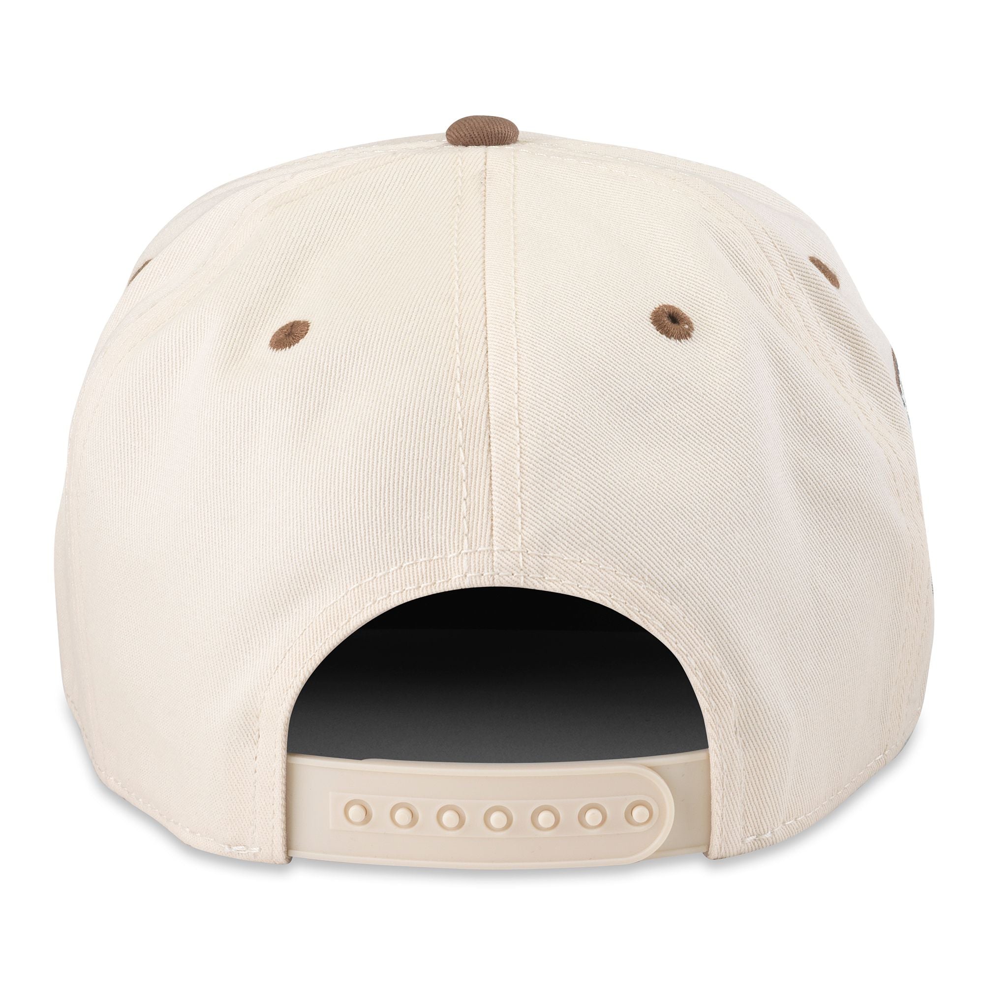 Washed Twill 5-panel with soft structured crown and slight curved visor. Braided nylon cord across seam and plastic snap closure. Front logo is merrowed twill patch or embroidery.