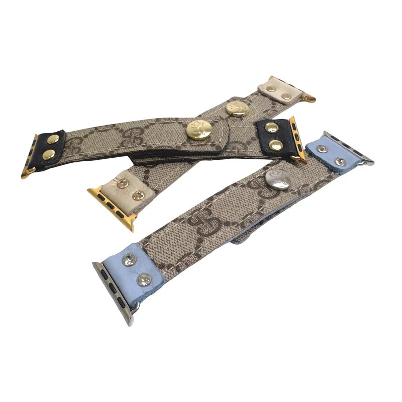 100% authentic Gucci monogram canvas upcycled into an Apple Watch Band. The snap closure makes it easy to put on and take off and adjusts to 3 different sizes. The layout of the print of monogram will vary on each band.