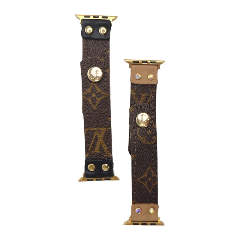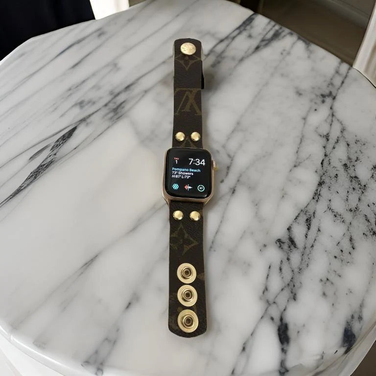 Feel fancy in this Upcycle Louis Vuitton Band for Apple Watch. Created from 100% authentic Louis Vuitton monogram canvas repurposed into a comfortable Apple Watch band. The triple snap closure makes it easy to put on and take off. Adjusts to 3 different sizes. The layout of the print of monogram and flower will vary on each band.
