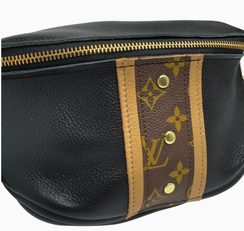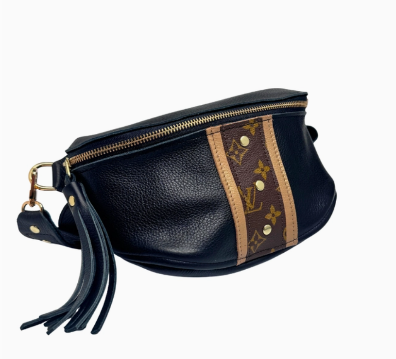 Embrace the latest leather handbag fashion trend with the designer Britt Belt Bag. Crafted from premium leather and repurposed designer Louis Vuitton canvas, this bum bag offers a unique blend of luxury and sustainability.