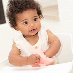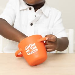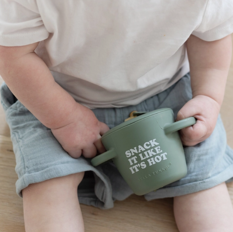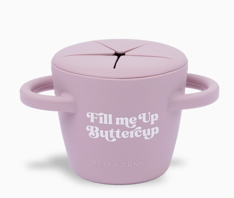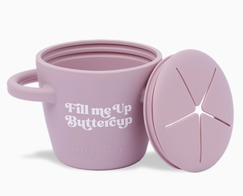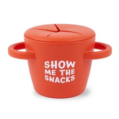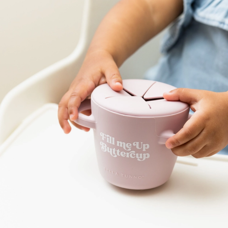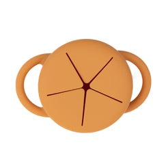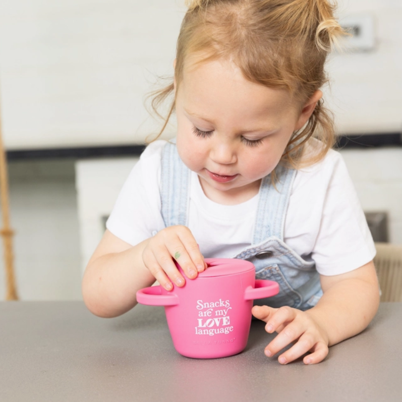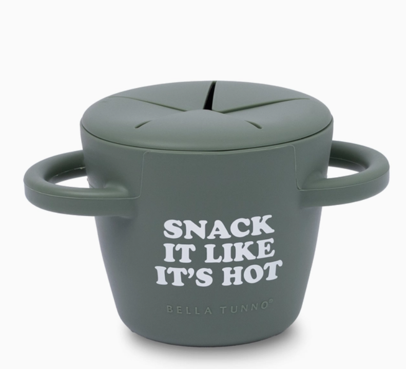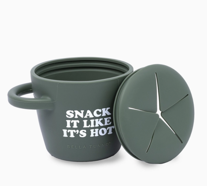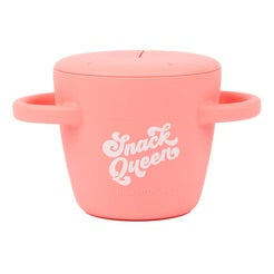 The Happy Snacker is a first-of-its-kind two-piece silicone snack cup with a mess-proof snap-tight lid and soft silicone opening so little hands can easily access food and prevent spills. Designed with easy-grip handles, it fits in car seats and stroller cup holders.