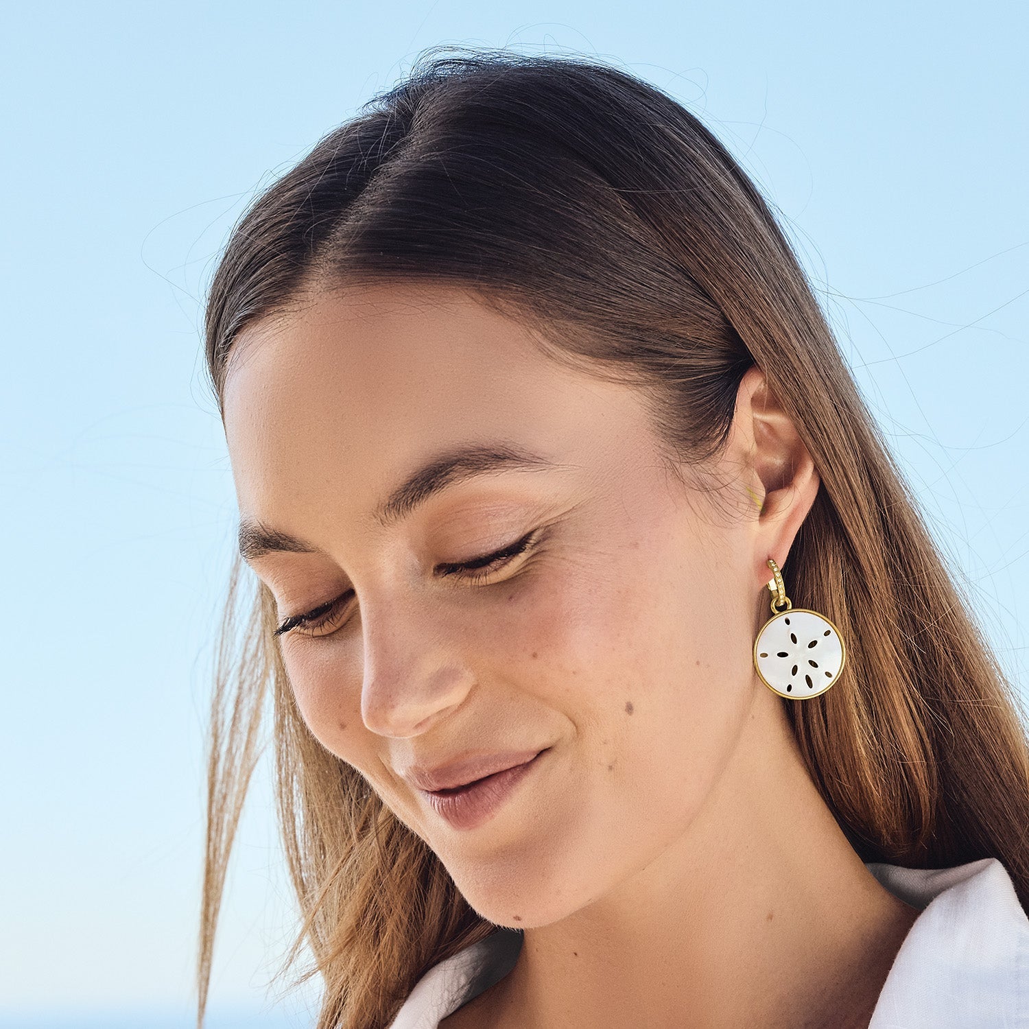 Sand dollar medallions custom-cut by artisans and framed in gold add beauty and a beachy touch to these statement earrings.
