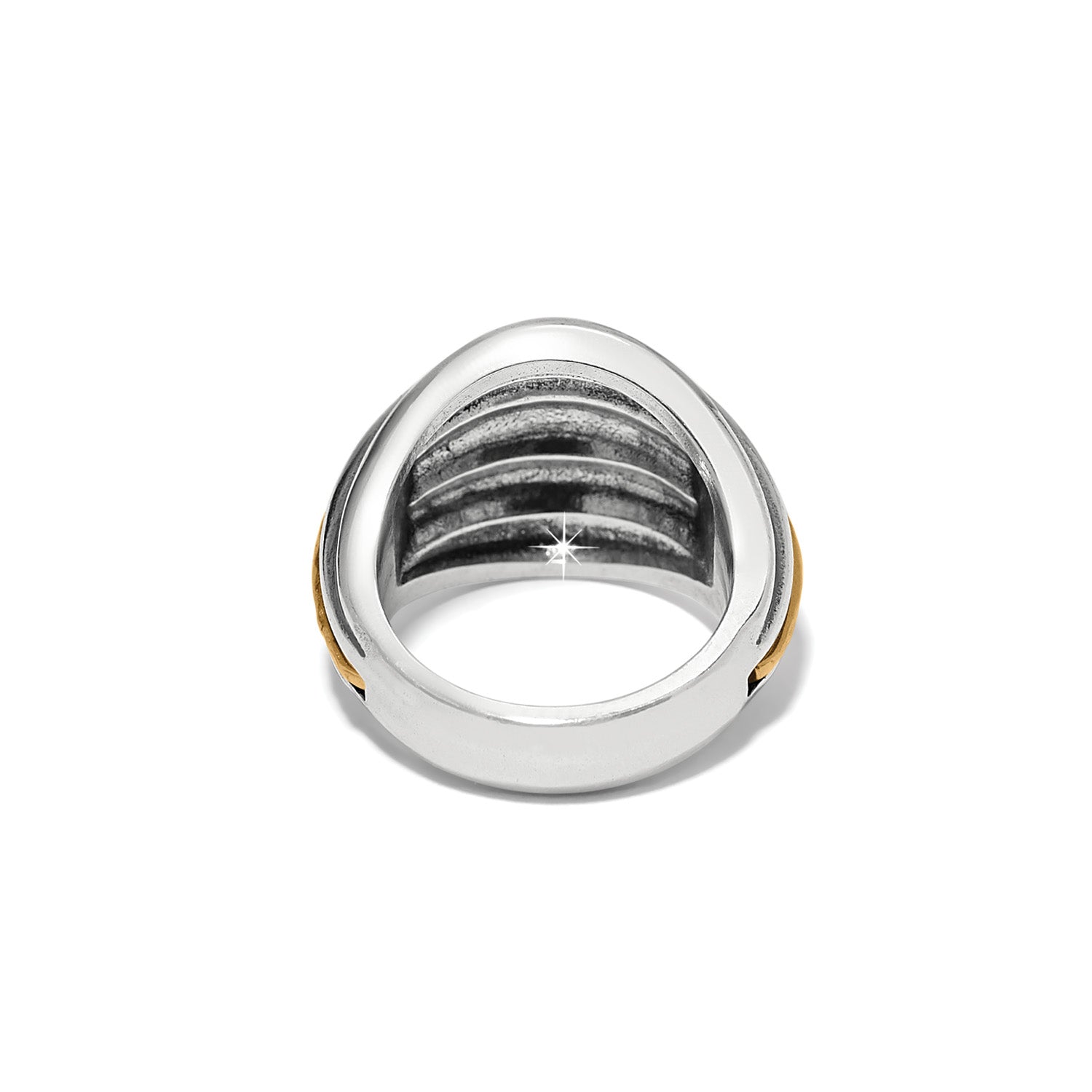 This Art Deco-inspired ring has simplicity, symmetry and a repetition of linear elements with two-tone hammered textures against highly polished domed curves. A scuptural masterpiece.