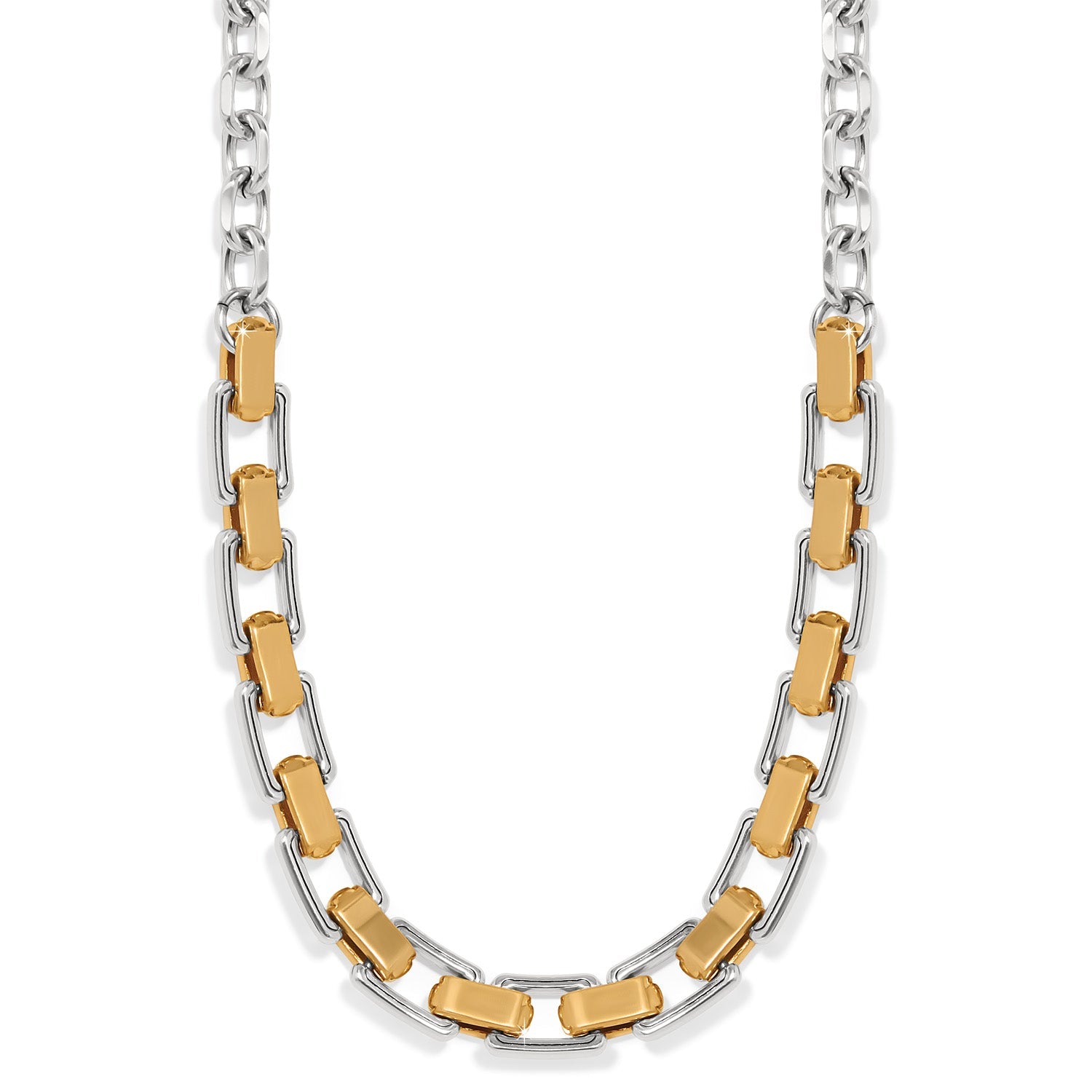 Two-tone links alternate with an elongated silver link and attach to a chain for the remaining length. Links are curved to lie nicely around the neck.