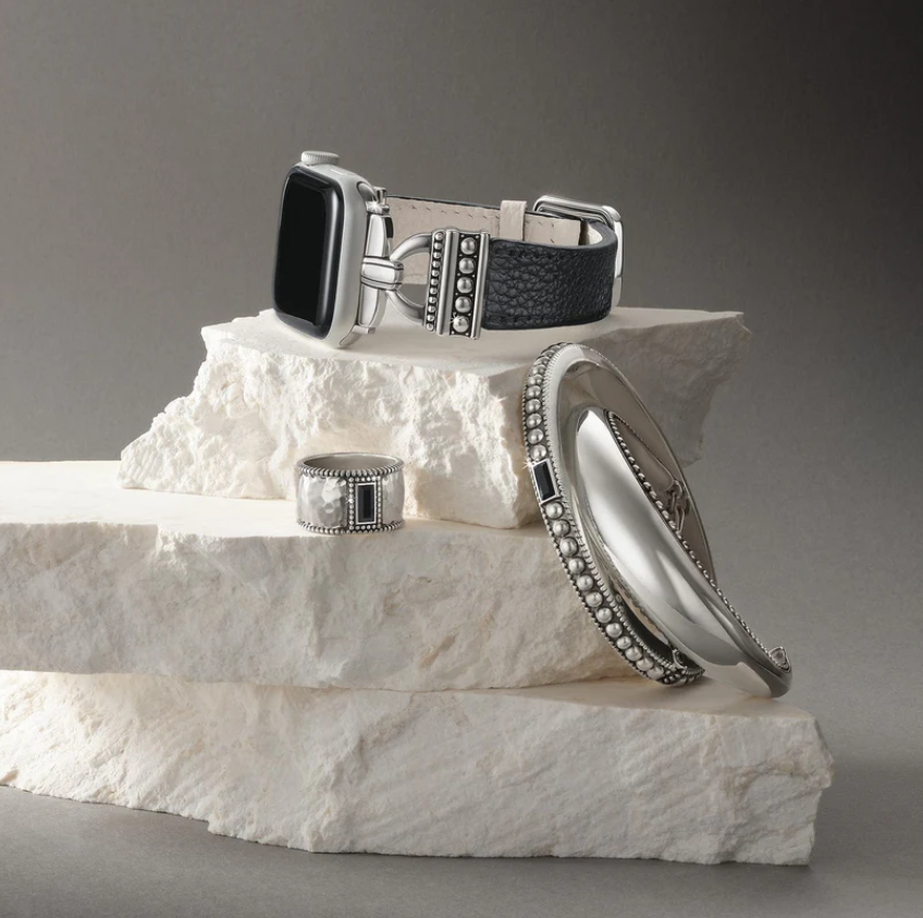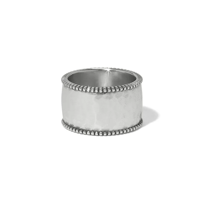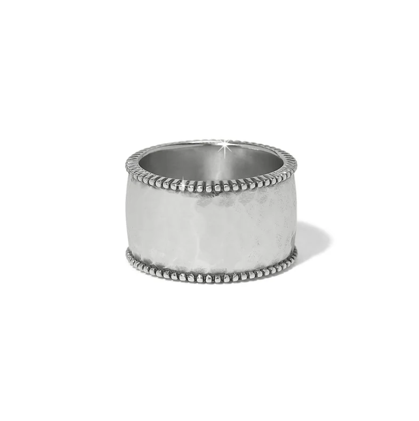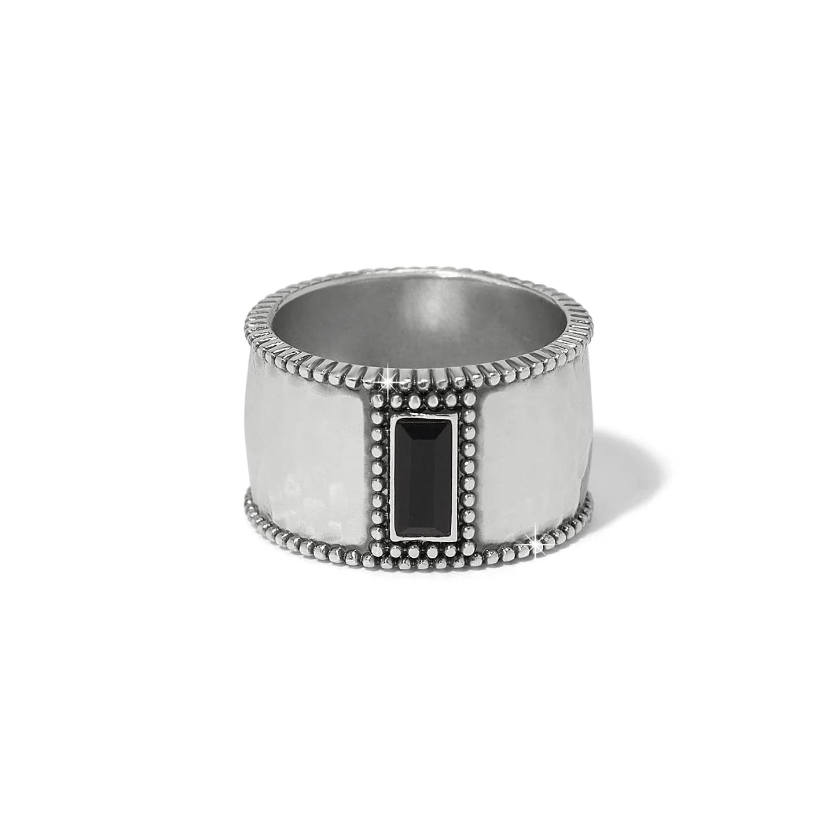 This cigar band style ring is a standout addition to the Pretty Tough Gem collection. A symbol of strength and sophistication, the design is inspired by the bands found on cigars, which were once considered symbols of opulence and exclusivity. The lightly hammered silver foundation is outlined with a fine row of granulation and in laid at center with a single stone baguette.