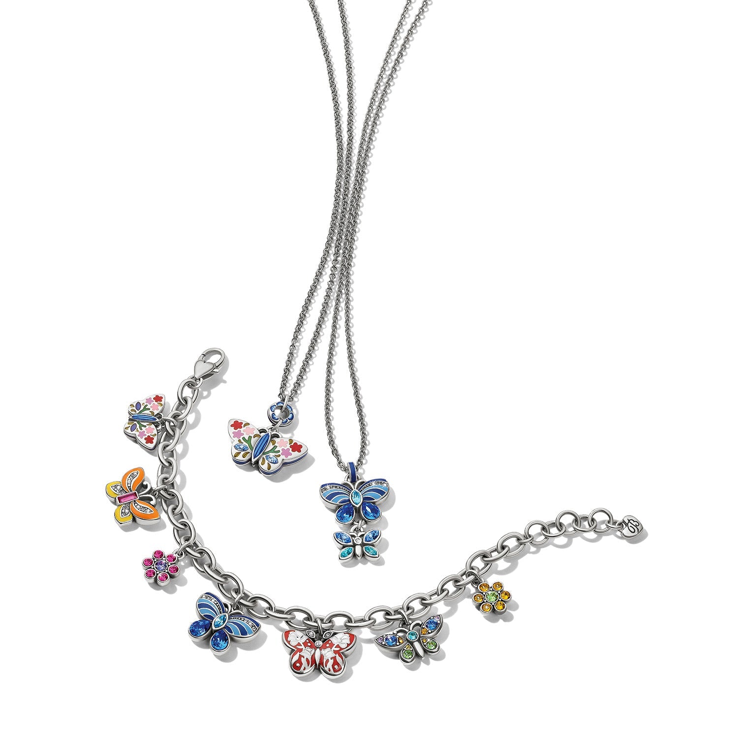 Multi-colored butterflies are hand enameled (based on our designer’s hand painting) and given hand-set crystal accents by artisans.