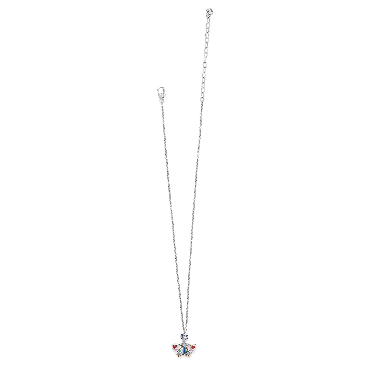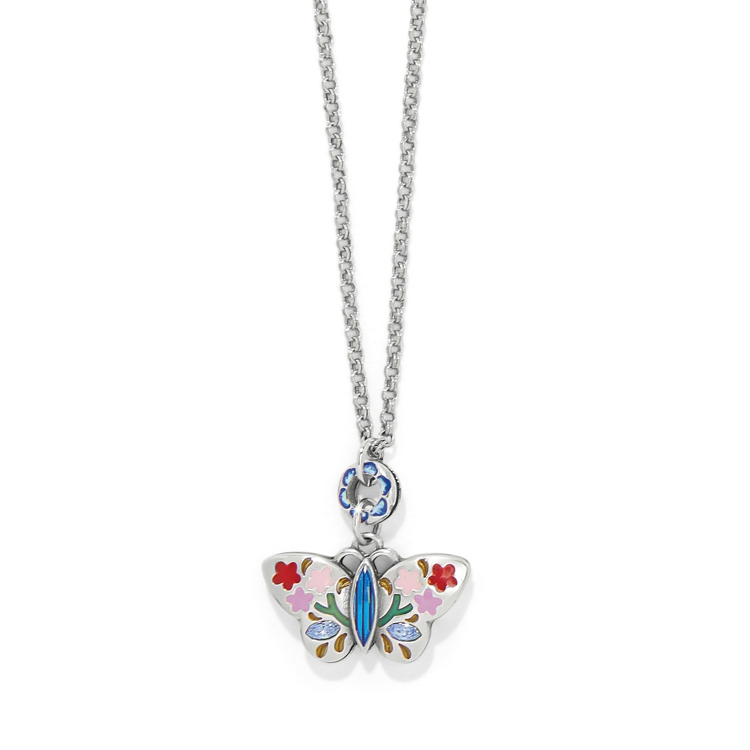 A single gorgeous butterfly is hand-enameled with floral details and hand-set crystal accents. The inspiration for this necklace was our designerโs trip to Australia.