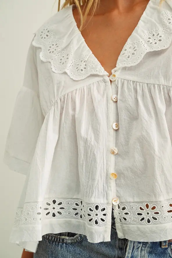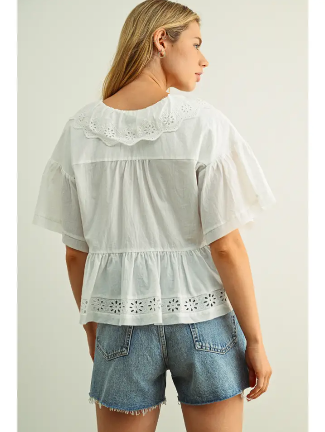 Sweet, airy, and effortlessly feminine. This 100% cotton eyelet blouse features delicate ruffle detailing, scalloped trim, and a flattering button-front design for that perfectly polished yet relaxed look. The lightweight fabric keeps it breathable and comfortable, while the subtle flare silhouette pairs beautifully with denim, skirts, or tailored shorts. It’s the kind of top that feels timeless yet still fresh.