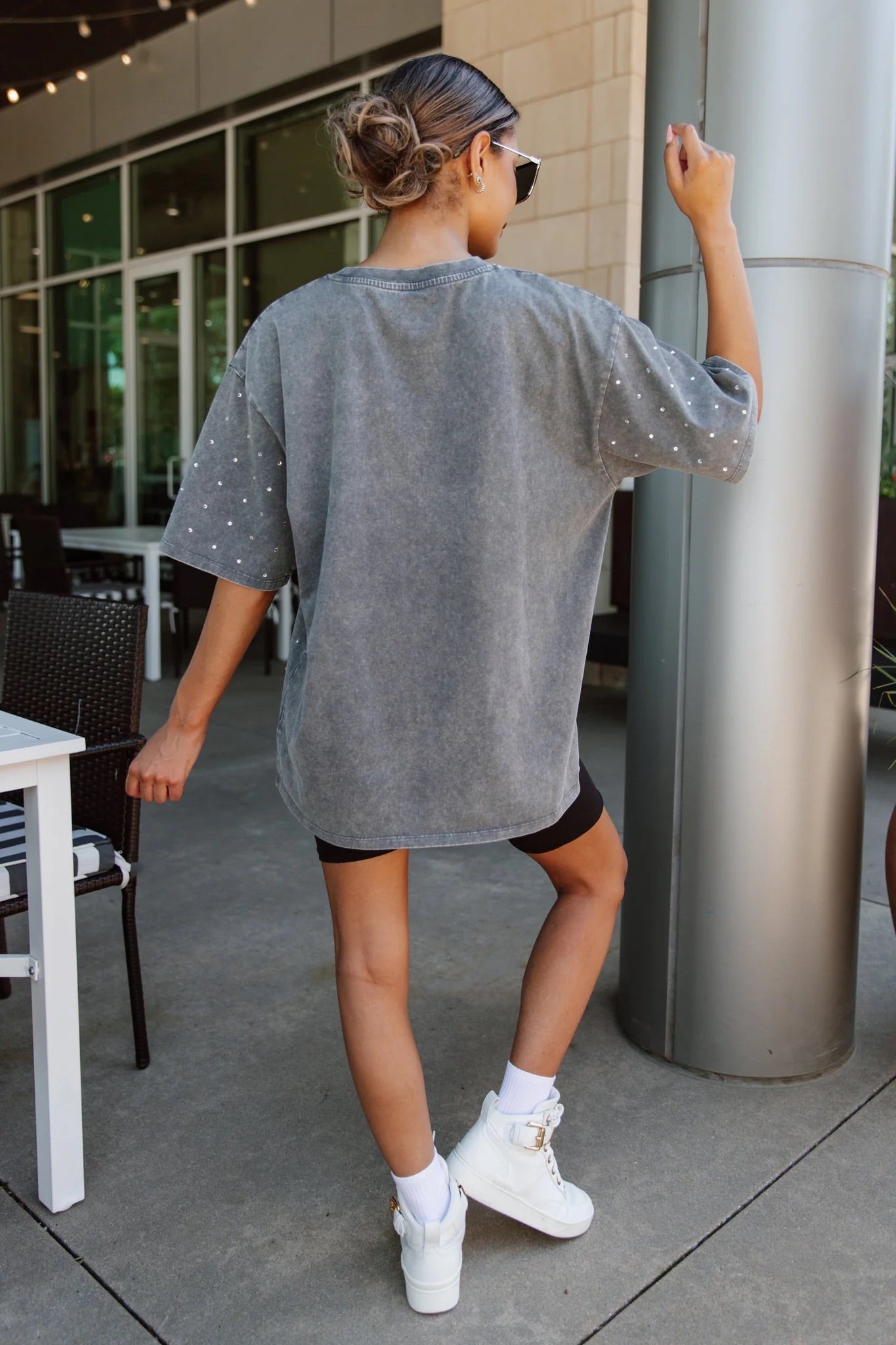 Make a statement in any crowd with our Cincinnati Bengals oversized fit, all-over mini rhinestone short sleeve tee featuring a ribbed neckline. Embrace the sparkle while staying comfortable—perfect for every dedicated fan.