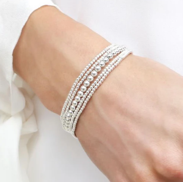Your classic, reliable, and go-to bracelet, now in sterling silver! Hand beaded on high performance elastic for a slight stretch to easily roll on and off your wrist.