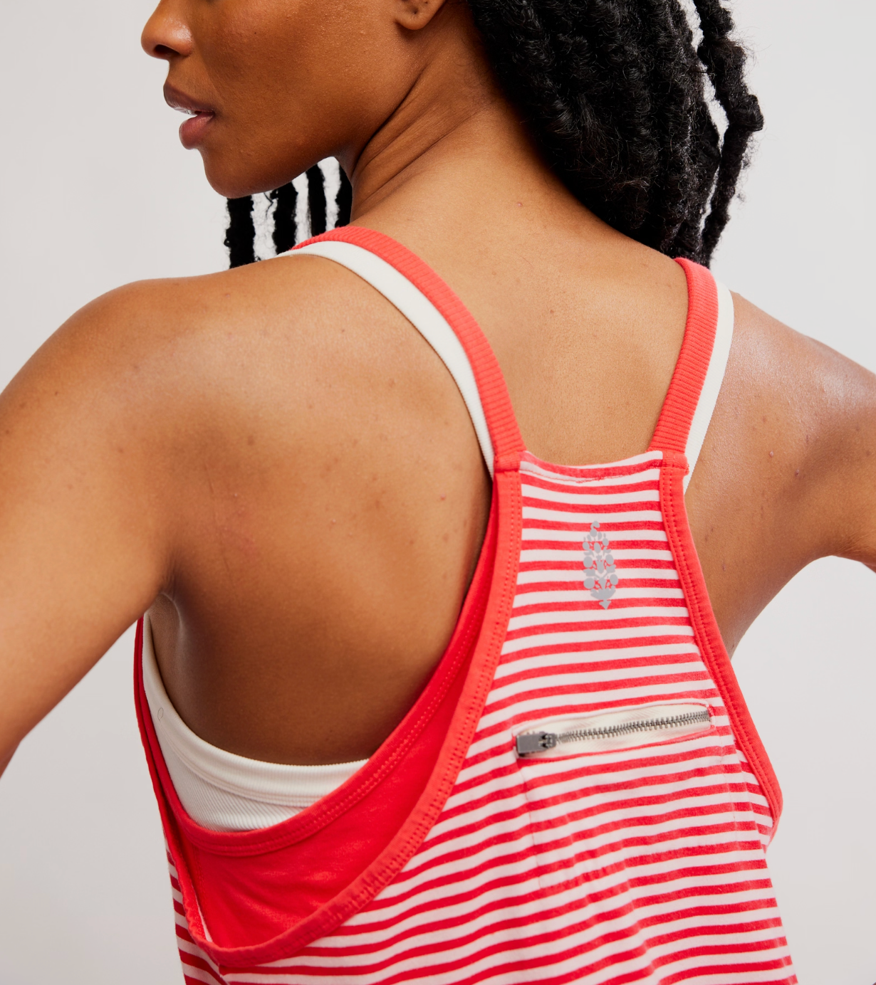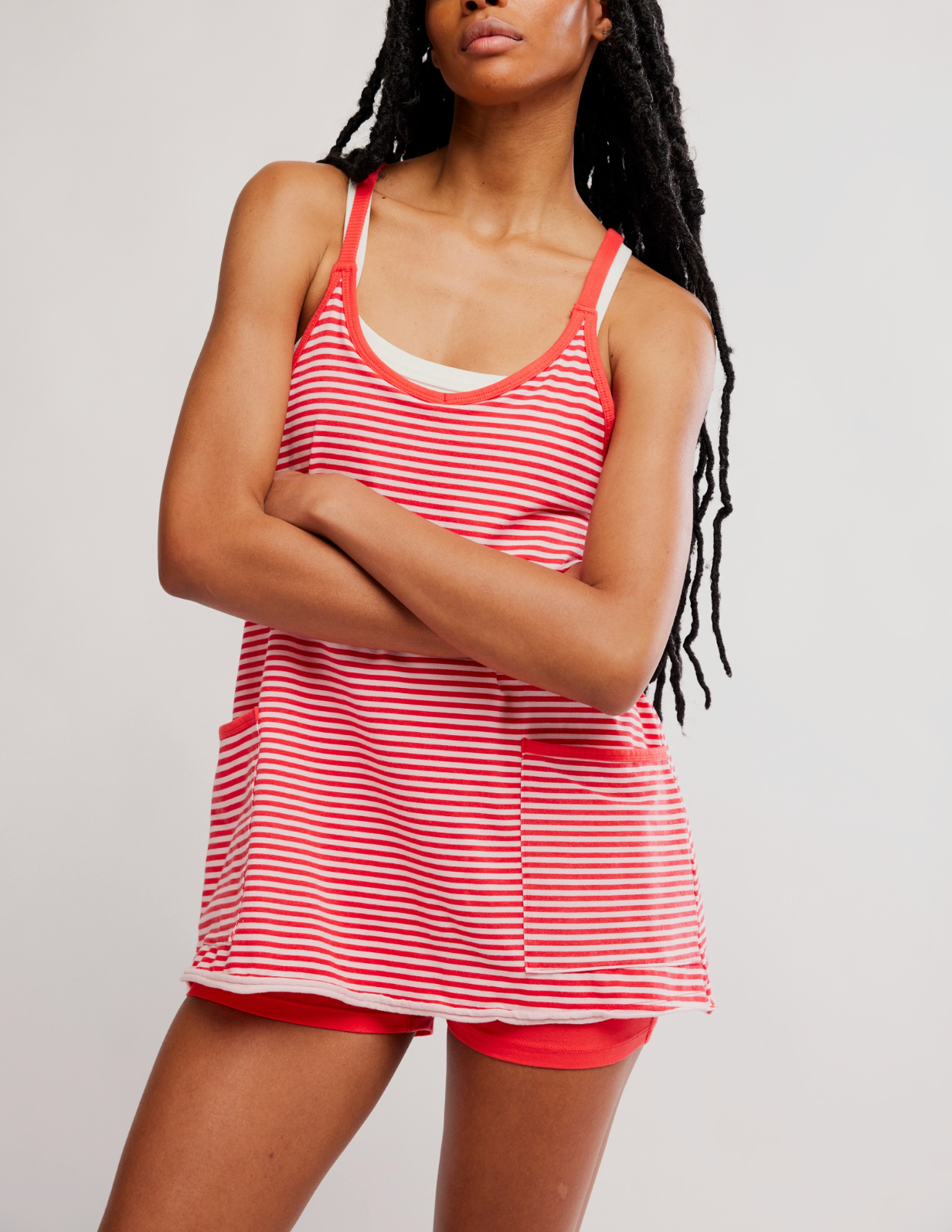 Features: Soft fabrication, lightweight design, scoop-neckline, thin shoulder straps, racerback detail with zippered pocket, oversized patch pockets at front, lined interior with shorts piecing at bottom