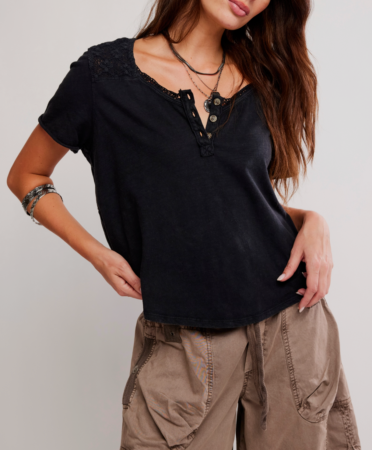Bring back effortless style with this airy top from our We The Free collection, featuring a lightweight, heathered cotton fabrication, a relaxed henley silhouette, and lace inserts for a delicate touch.