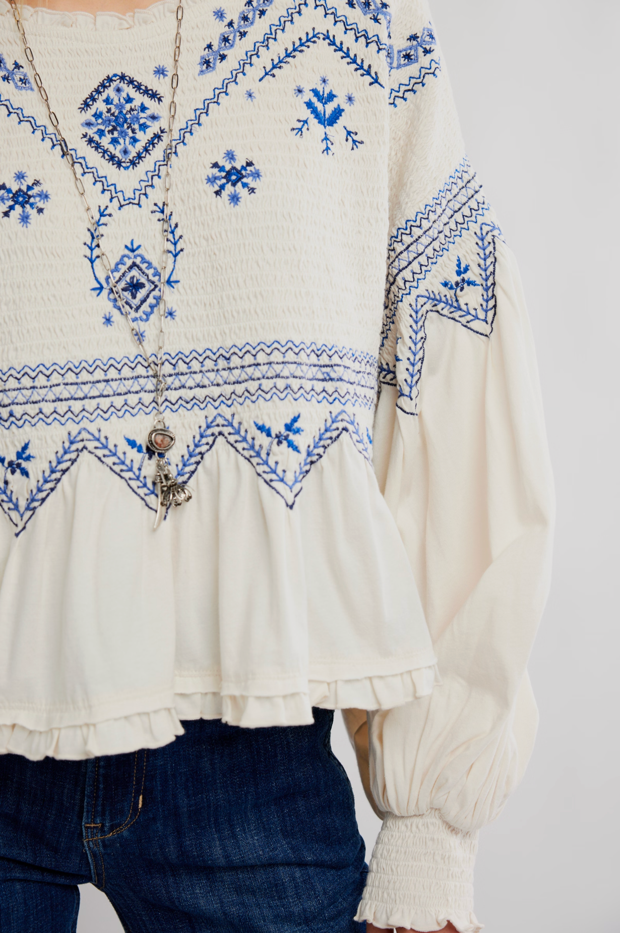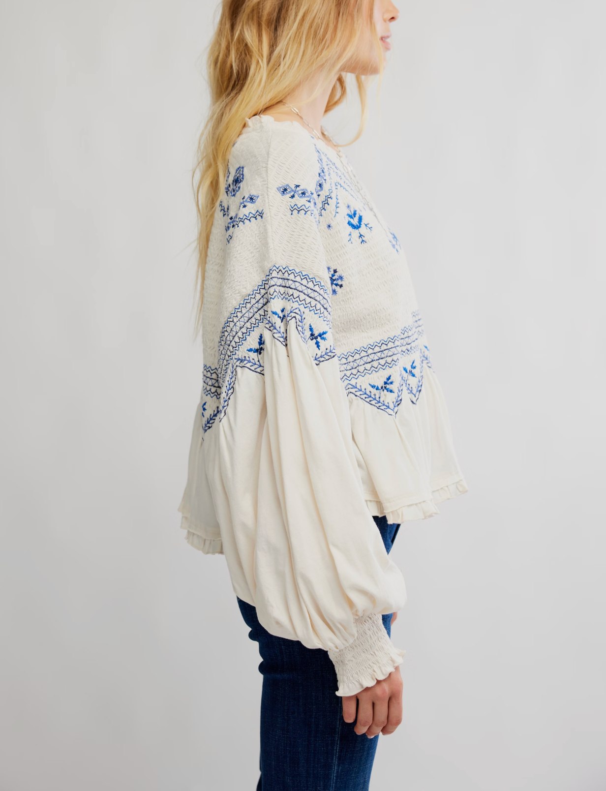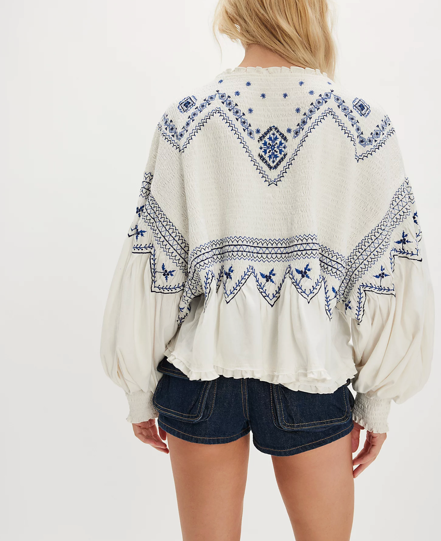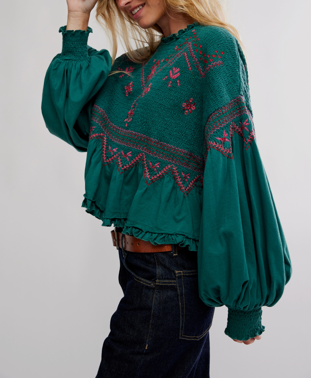 Breezy, billowy, and beautiful, this long-sleeve top features lightweight cotton fabrication, a flowy peplum design, and exaggerated balloon sleeves for an effortless silhouette.