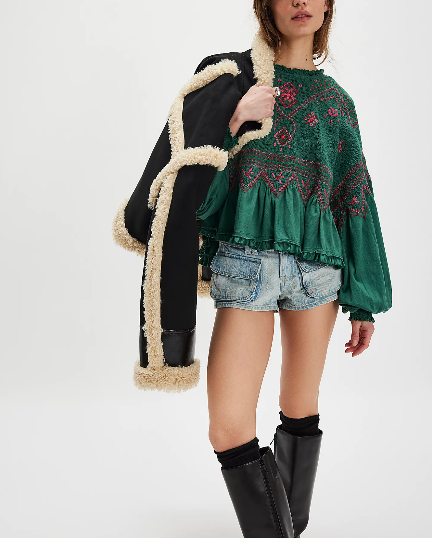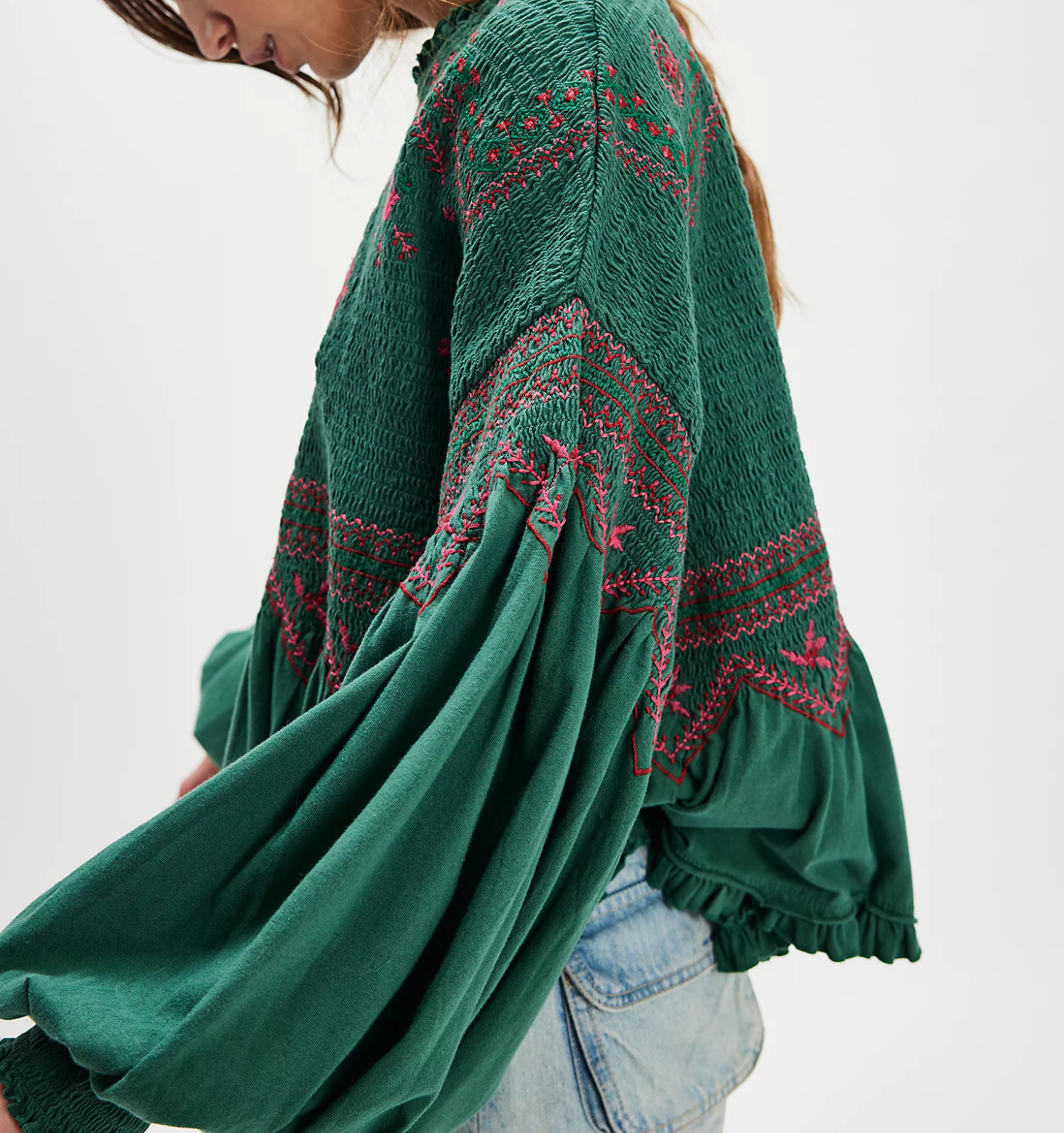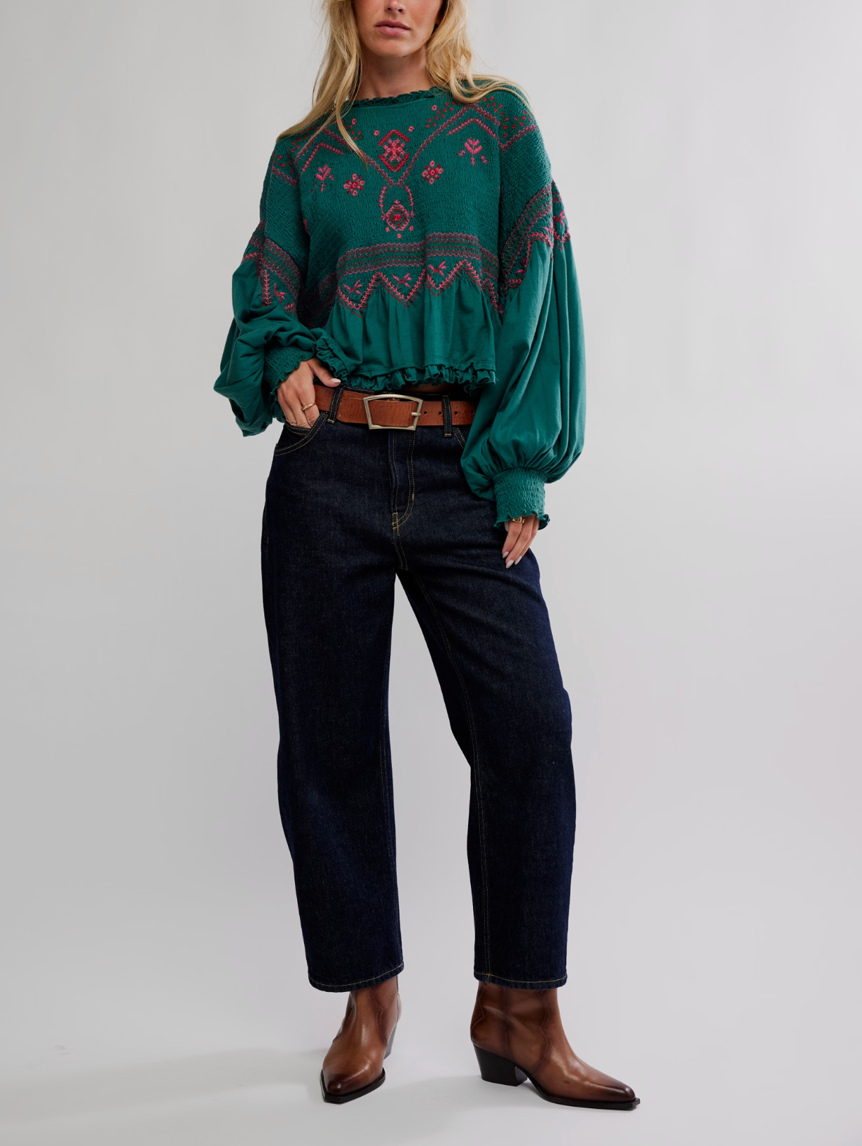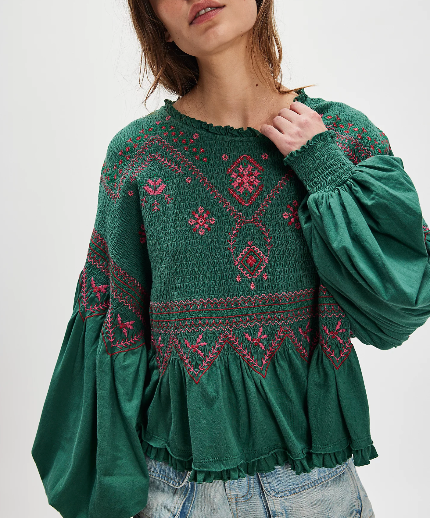 Breezy, billowy, and beautiful, this long-sleeve top features lightweight cotton fabrication, a flowy peplum design, and exaggerated balloon sleeves for an effortless silhouette.