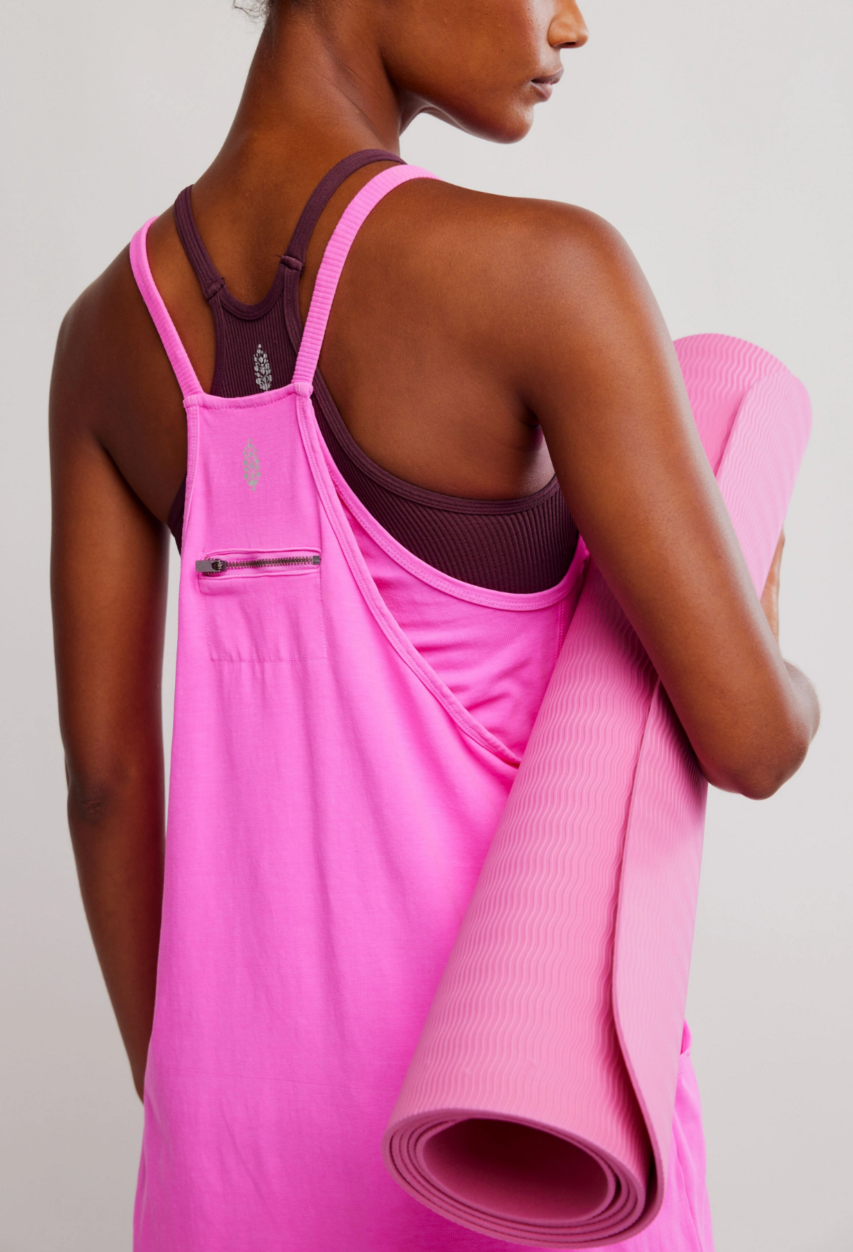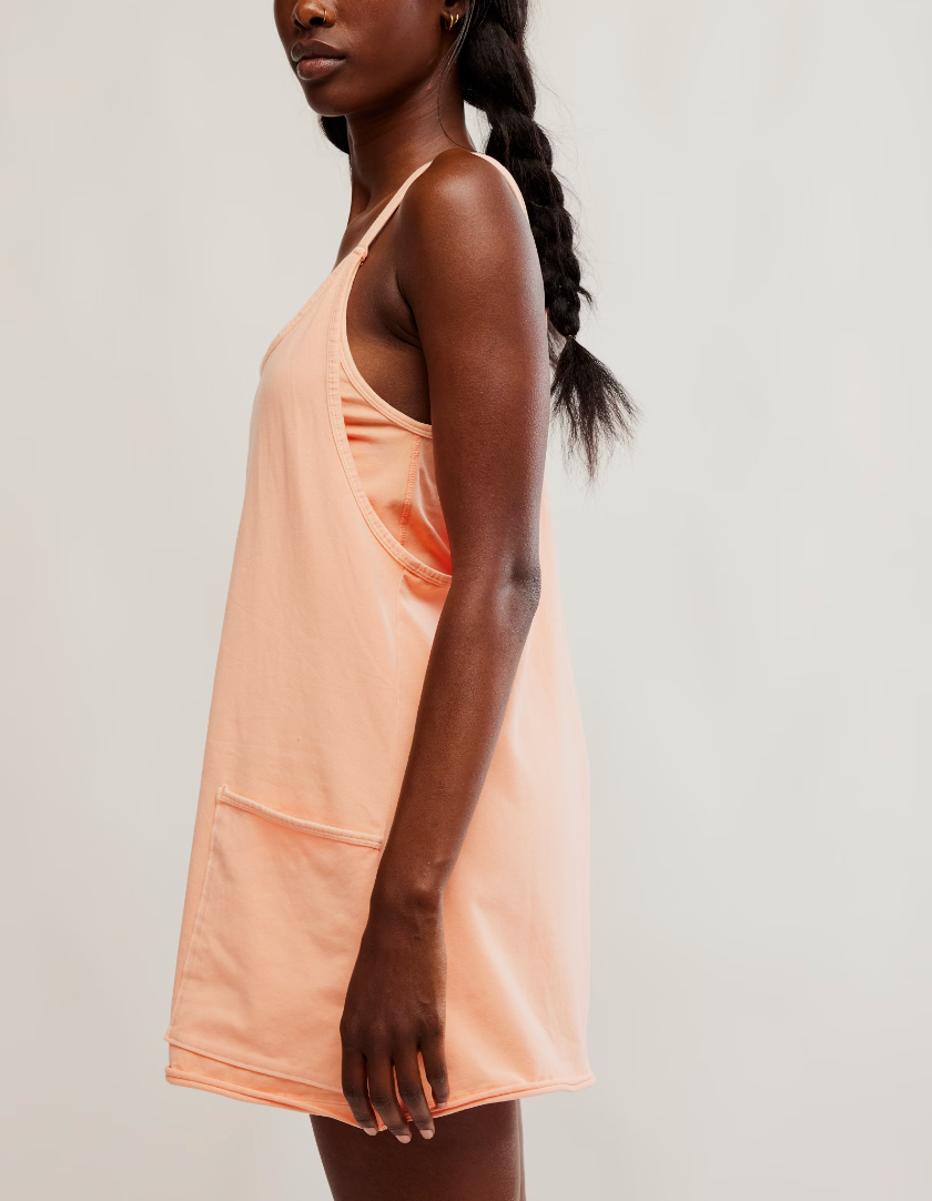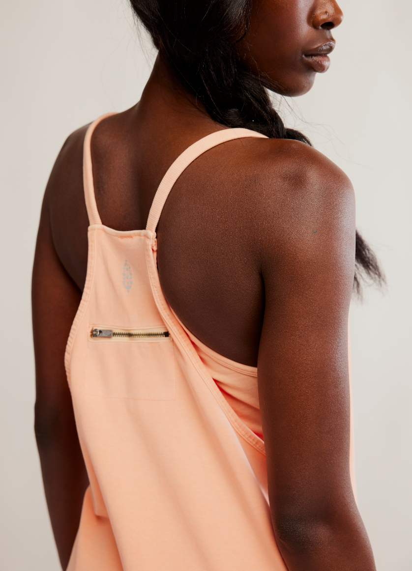 Features: Soft fabrication, lightweight design, scoop-neckline, thin shoulder straps, racerback detail with zippered pocket, oversized patch pockets at front, lined interior with shorts piecing at bottom