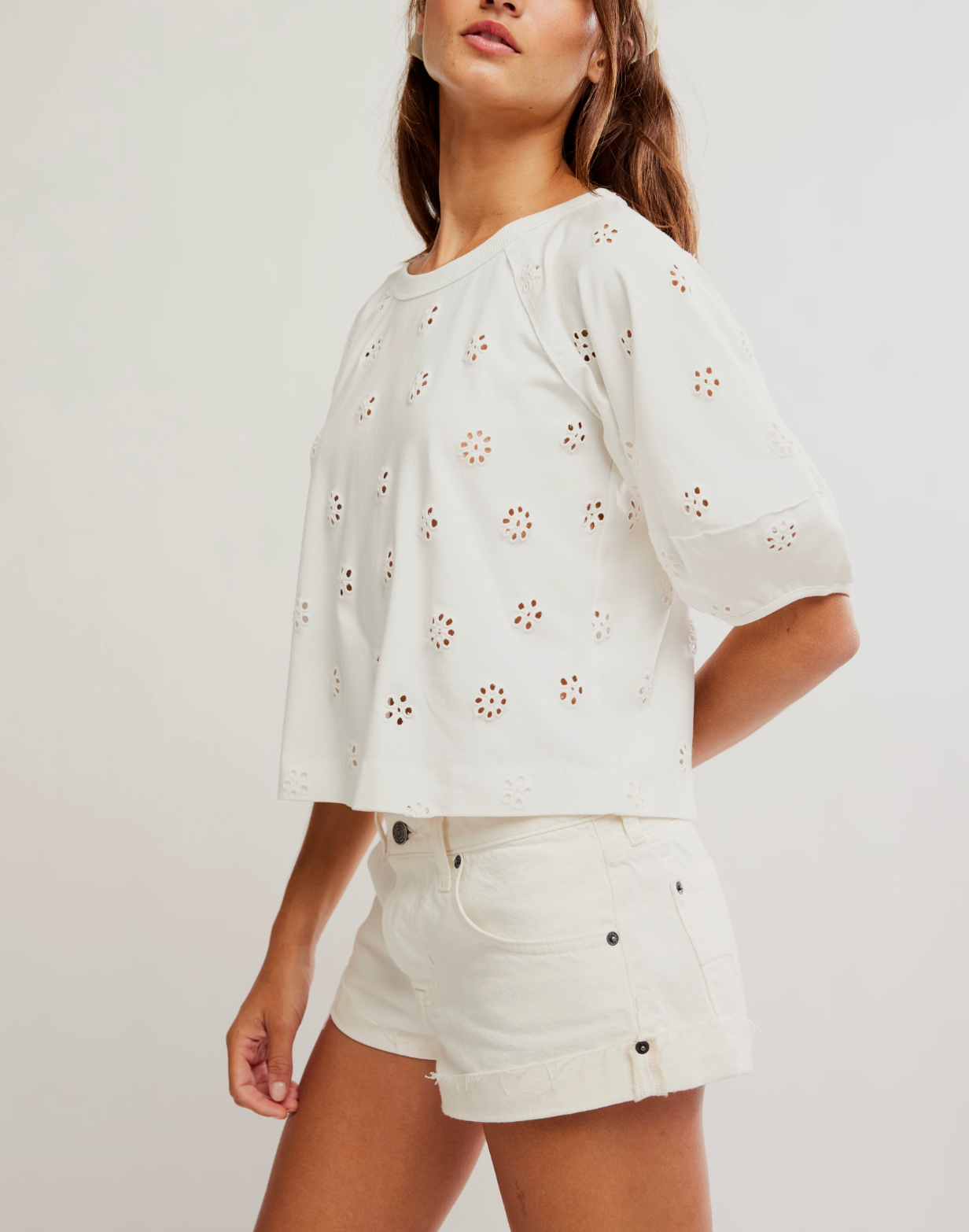 Embody effortless whimsy with this airy tee, featuring a cropped, boxy silhouette, exaggerated puff sleeves, and a lightweight cotton-blend fabrication for a breezy feel.