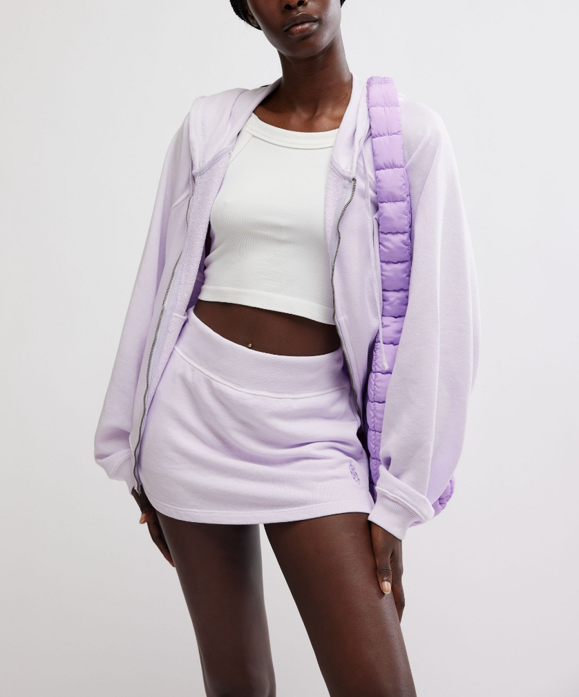 Go from the studio to the street in this soft set featured in a french terry fabrication with a slouchy zip-up and matching skort.