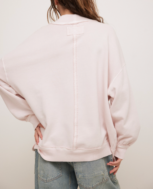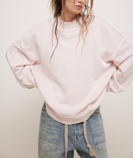 Features: French terry fabrication, mock neckline, drop-shoulder long sleeves, ribbed trim, exposed seams