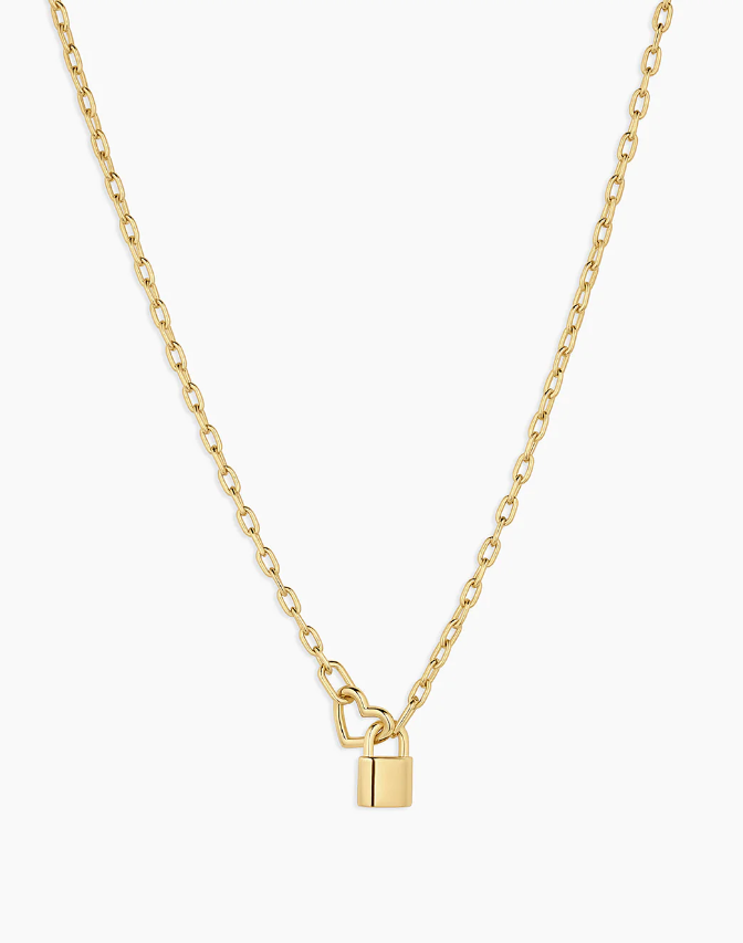 Lock it up and throw away the key. We're all in on this new, gold plated heart padlock interlocking necklace.