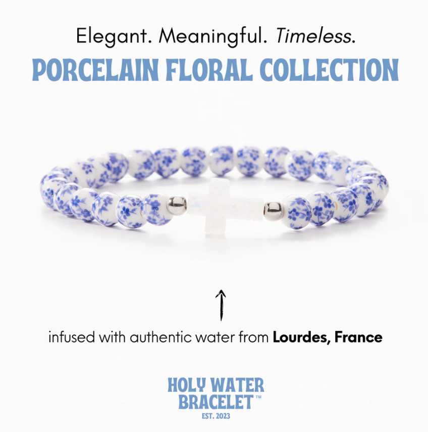 Discover the timeless beauty of our porcelain floral collection, where tradition meets contemporary style. Crafted with 6mm porcelain beads adorned with a delicate blue floral pattern, this bracelet showcases our signature cross infused with authentic holy water sourced directly from Lourdes, France.