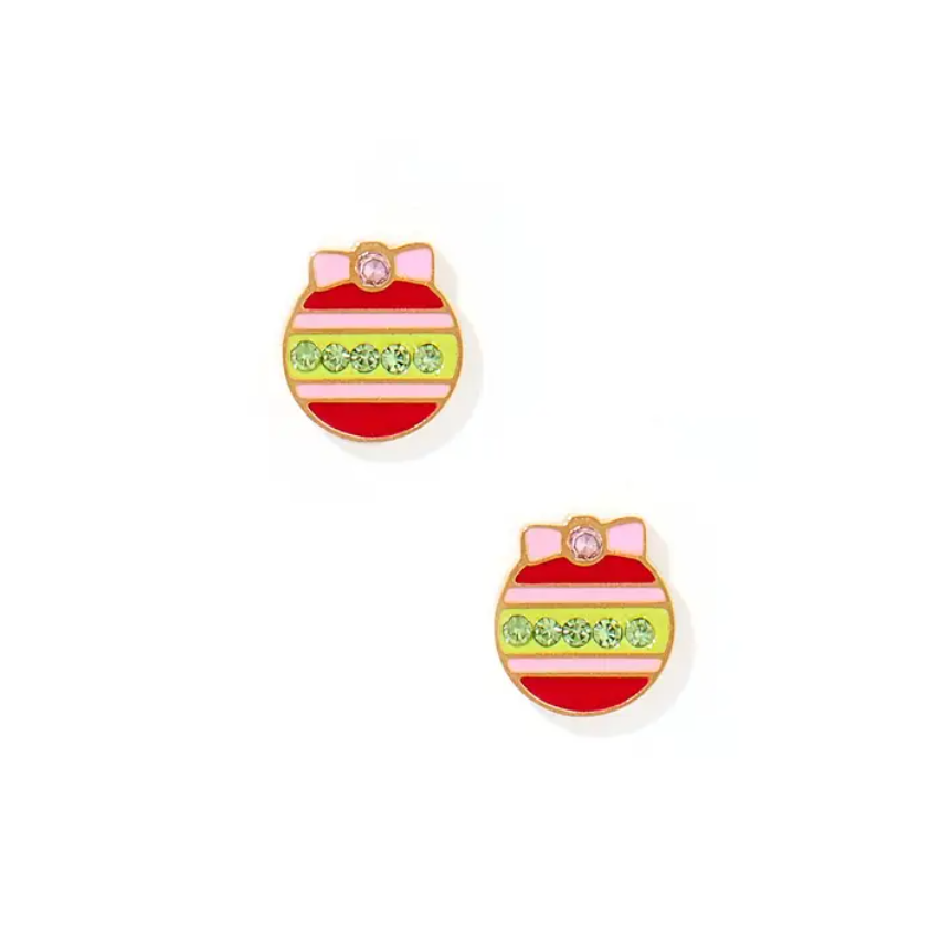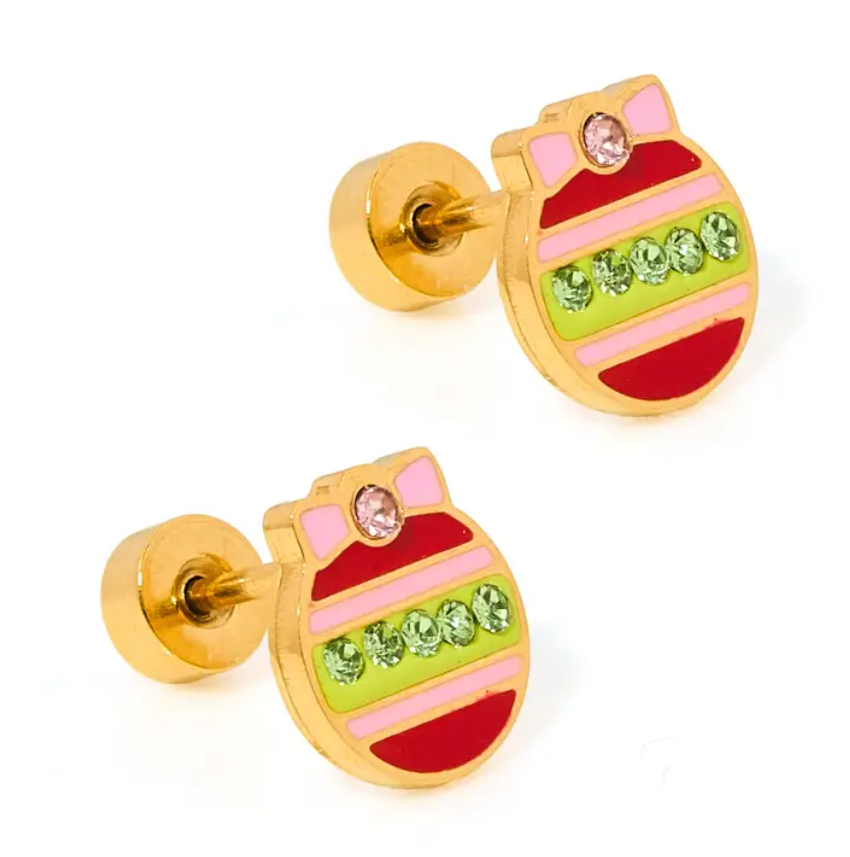 Add a festive touch to any look with the Ornament Design Screwback Stud Earrings. These 8mm studs are designed with a colorful enamel ornament featuring red, pink, and green hues, complemented by a sparkling pink CZ stone at the center. Perfect for both kids and adults, the secure screwback design ensures these earrings stay comfortably in place throughout the day. These durable, waterproof studs are ideal for the holiday season, offering both style and long-lasting comfort.