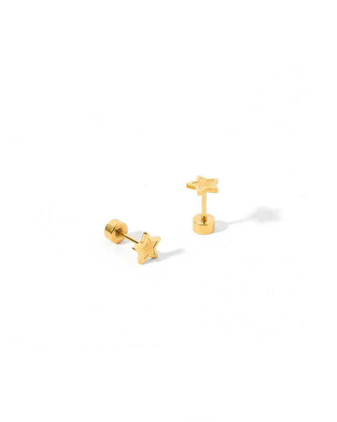 Playful and shining, the Lennon Screwback Stud Earrings feature a petite cut-out star design crafted in polished gold-toned stainless steel. With their lightweight feel and secure flat-back screw post, these hypoallergenic studs bring everyday comfort and a hint of cosmic charm to any ear stack.
