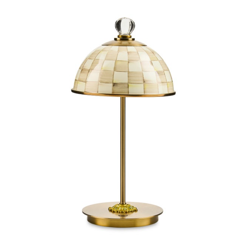 The LED Rechargeable Dome Table Lamp is the little light that shines big without the inconvenience of cords. Featuring our signature check pattern on an elegant dome shape, it illuminates for up to three hours and recharges with a 5-watt USB cable (included). It operates with ease by tapping the shade on the top, and there are three settings for brightness.