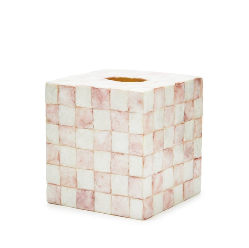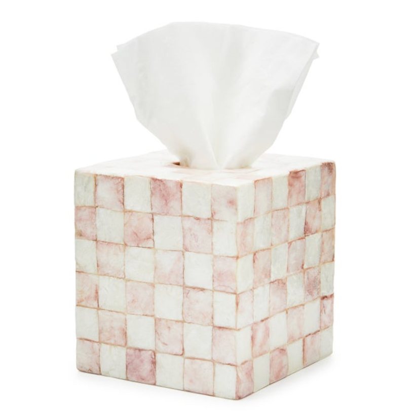 Be ready for every sneeze with the Boutique Tissue Box Cover. It’s decorated with an inlaid pattern of our signature checks on capiz.