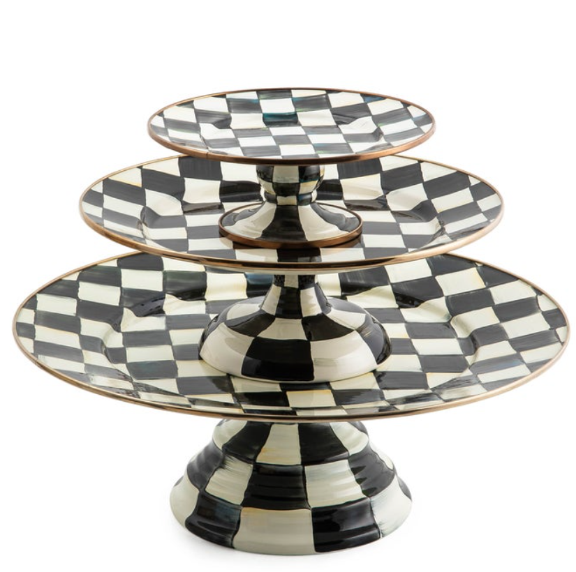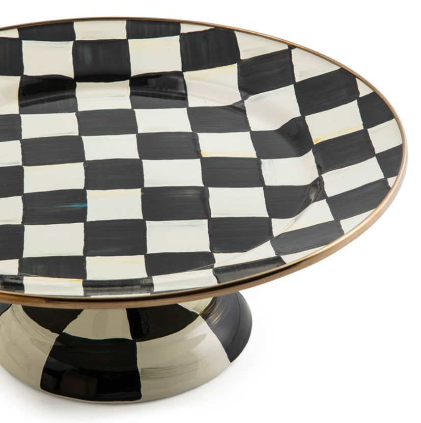 The center of attention at every gathering, whether empty or piled high with petite cupcakes. Hand-painted checks reveal a spectrum of accent colors. Steel underbody and bronzed stainless steel rim.