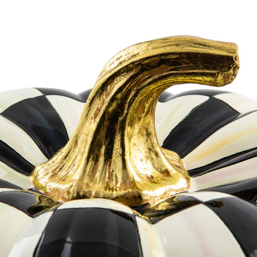 Take your pick from our most unusual pumpkin patch with the Medium Courtly Check® Squashed Glossy Pumpkin, featuring hand-painted Courtly Checks with a glossy finish, trimmed with a gold leaf stem.