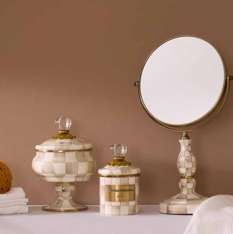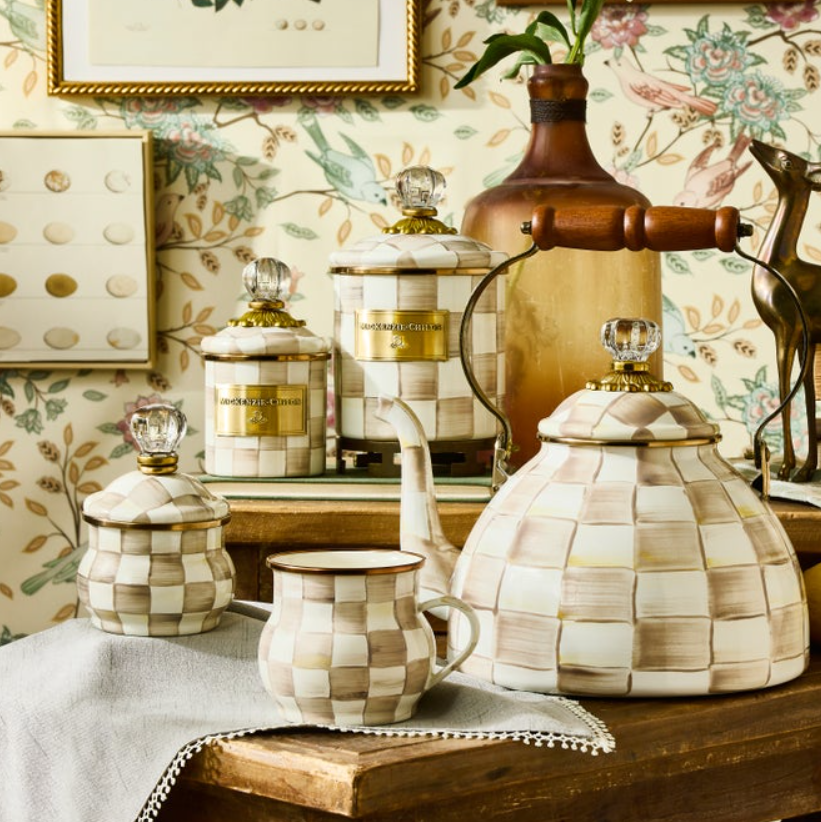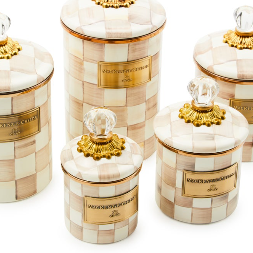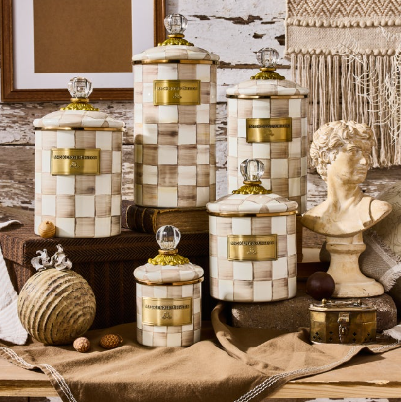 Add to the endless possibilities for our canisters with the Mocha Check Mini Canister. Our smallest sized canister, the Mini stands handsomely alone or harmonizes delightfully in a set. Keep it in the kitchen or invent new uses around the house. Each enameled steel canister is hand-painted with color-dragged, coffee-colored checks and topped with a glass knob.