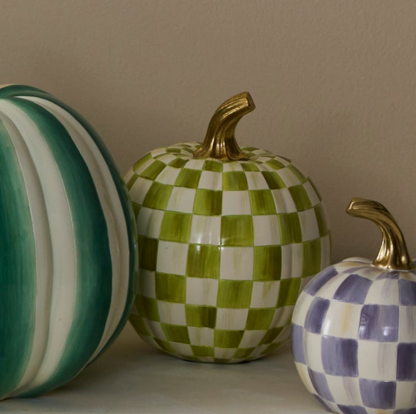 Take your pick from our truly unique pumpkin patch with the Moss Check Small Pumpkin. Decorated in our moss green checks and topped by a glimmering gold stem, this decorative gourd is sure to be a favorite in any autumnal display.