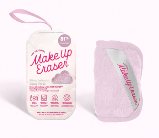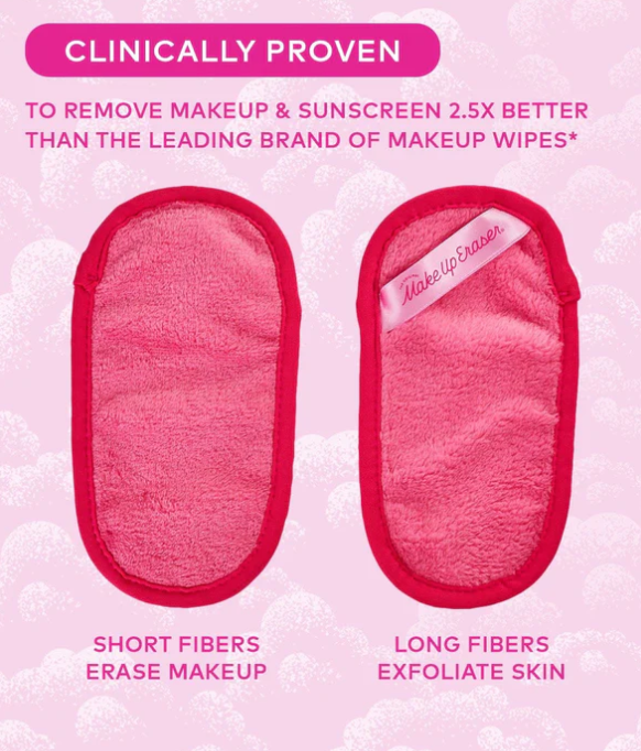 Erase all makeup with JUST WATER™ including waterproof. Our patented, water-activated, cloud-soft fibers gently & easily remove all makeup & sunscreen from pores. 2 in 1 benefit: one side erases makeup & one side exfoliates skin.