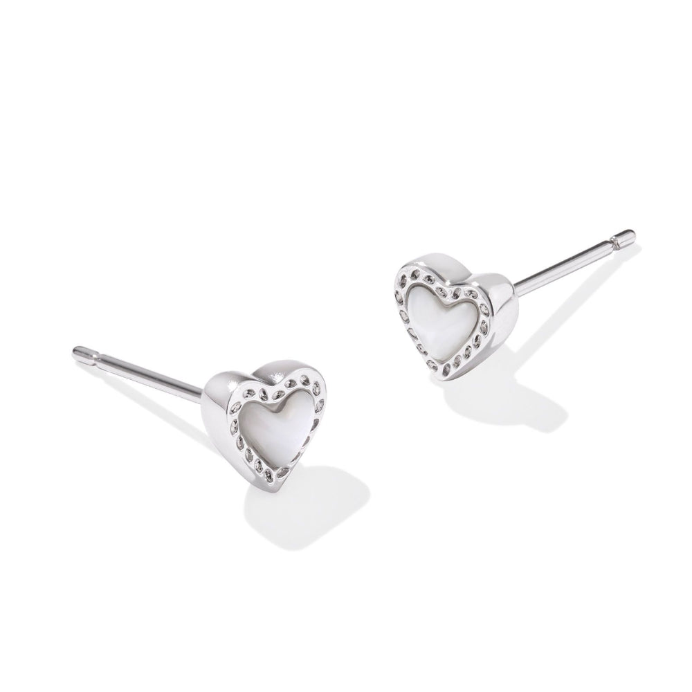 Gold heart shape stud earrings with a red charm in the middle, from the jewelry brand Kendra Scott.