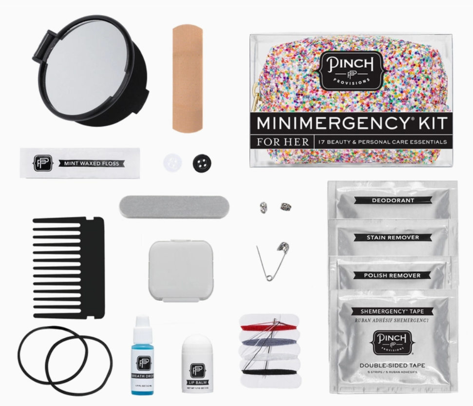 The kit contains: stain remover towelette, emery board, double-sided tape, pill container, safety pin, lip balm, mending kit, mini comb, hair bands, dental floss, earring backs, adhesive bandage, nail polish remover pad, deodorant towelette, extra buttons, compact mirror and breath freshener.