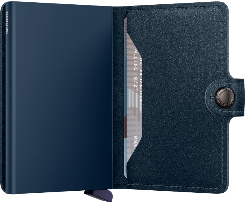 Small in size and surprisingly large in storage capacity, the Miniwallet combines the best of both worlds. The exterior holds banknotes, receipt and cards, while the aluminum Cardprotector allows you to slide out cards with one simple motion and protects them from bending, breaking and unwanted wireless communication.