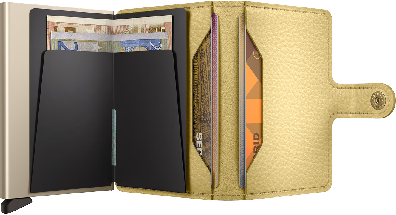 Small in size and surprisingly large in storage capacity, the Miniwallet combines the best of both worlds. The exterior holds banknotes, receipt and cards, while the aluminium Cardprotector allows you to slide out cards with one simple motion and protects them from bending, breaking and unwanted wireless communication.