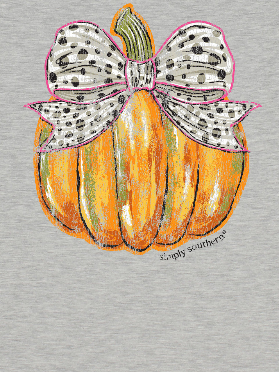 Light heather grey short sleeve shirt with a pumpkin topped with a polka dotted bow. Simply Southern logo below. Similar design on left chest. 98% cotton / 2% polyester blend. Unisex sizing.