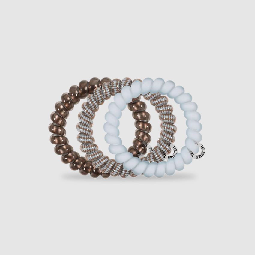 Truly Taupe Large Hair Ties in Blue and Taupe offer a strong grip without damage, doubling as a chic wrist accessory when not in use. Your new favorite hair essentials all year round.