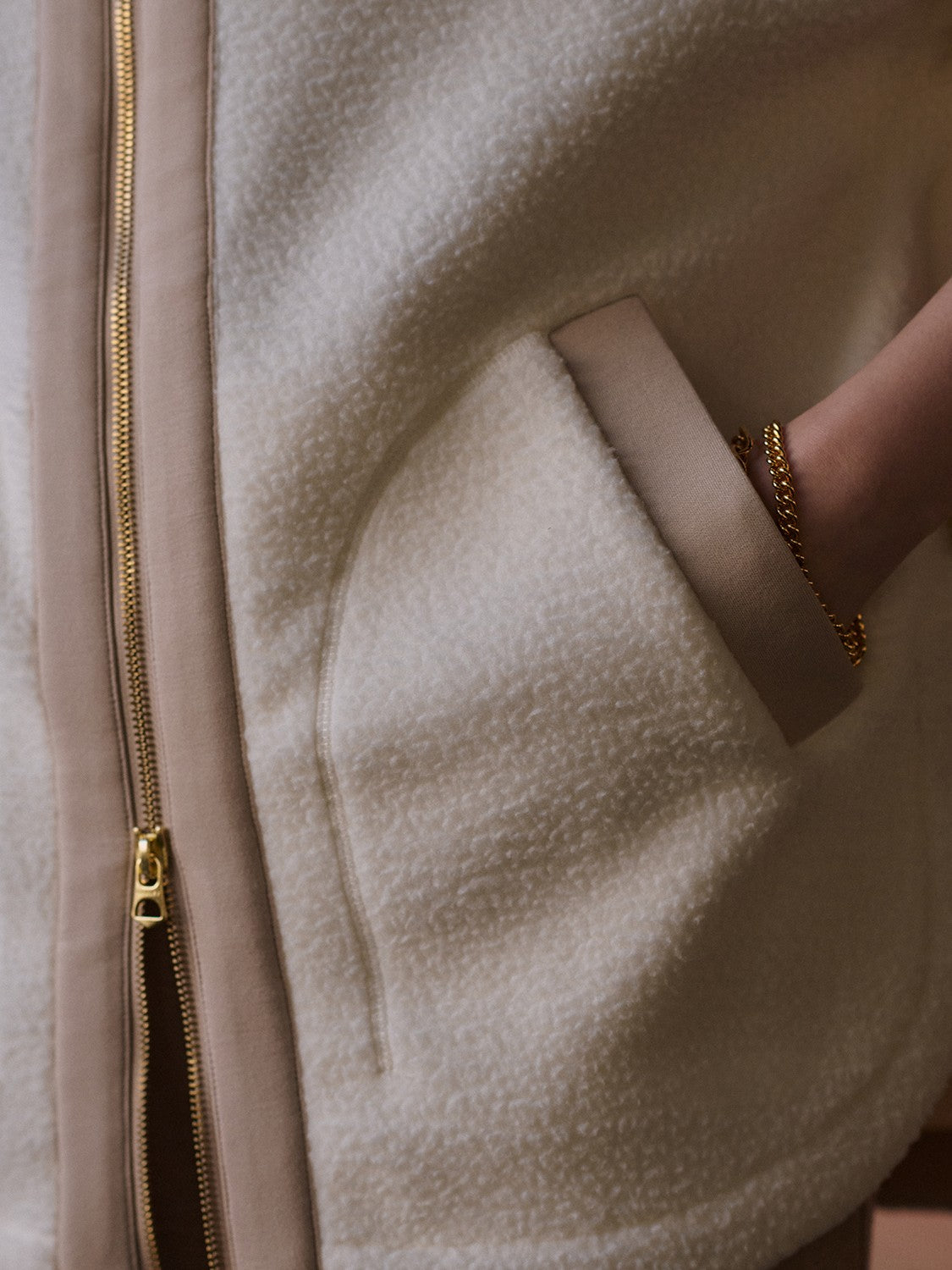 Layer up in the Fey hooded fleece for walks in colder temperatures or relaxed wear inside. Crafted from soft fleece patched with our signature DoubleSoft® fabric, it offers warmth and comfort. The curved hem and soft sleeve shape ensure a flattering fit. The design is complete with contrast details, dye-to-match drawcords, and Varley-branded zip pullers, while large pockets add functionality.