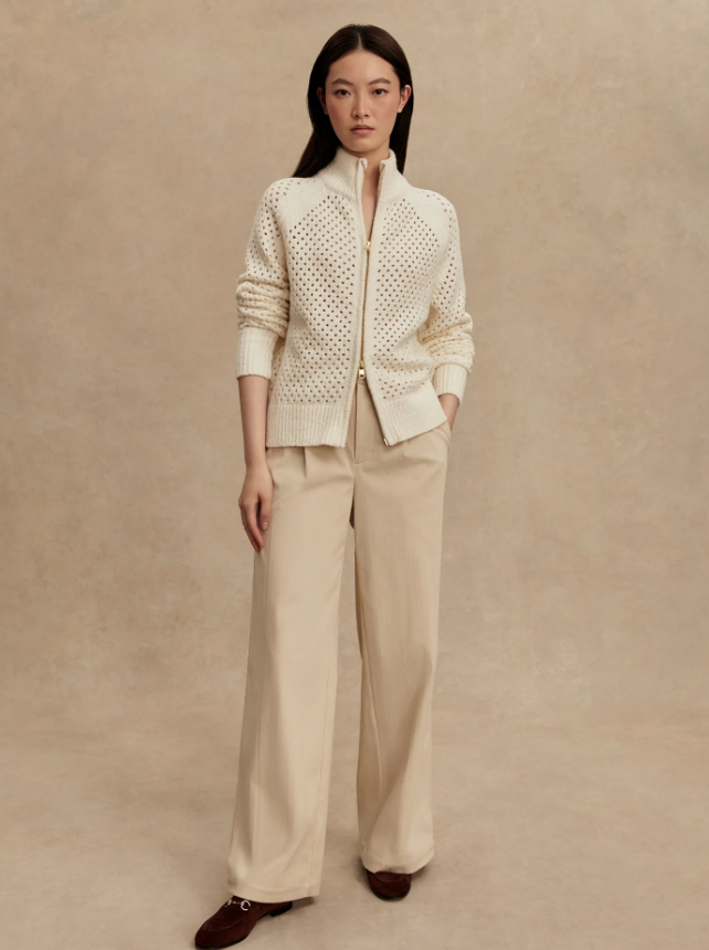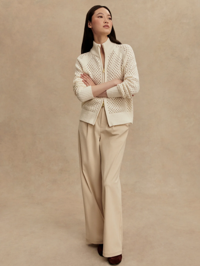 A move on from the coveted Marta, the Mandy has a refined fit for versatile everyday styling. Crafted from a cotton blend bouclé yarn in an all-over mesh pointelle stitch with fashioned raglan sleeves. The texture, high-neck collar, and double-ended zip front elevate the design.